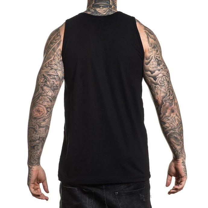 Stylish men’s tank top with both front and back print, by SULLEN. Composition: 50% cotton, 50% polyester. Color: black. Approx. dimensions in centimeters (CIRC. is 2x width)